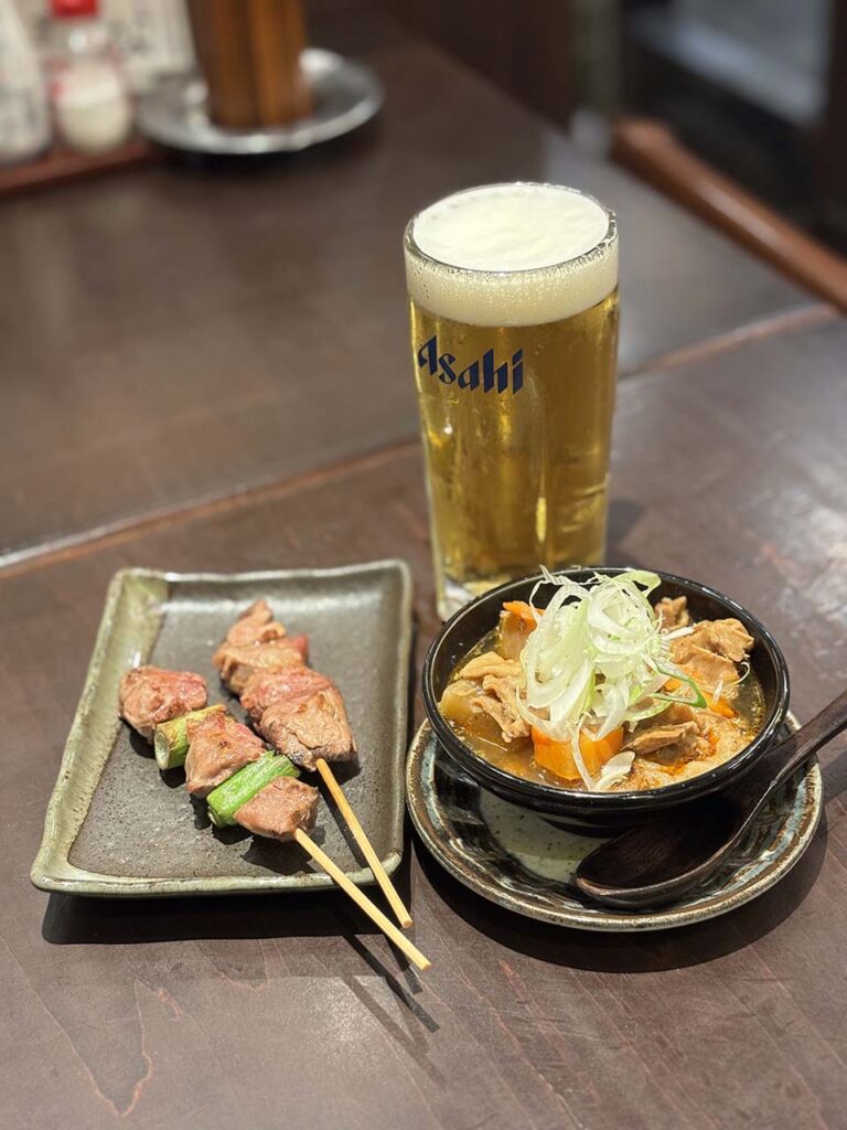 炭火で香ばしく焼き上げた串2本と、名物もつ煮ハーフをドリンクと共に楽しめるセットです。