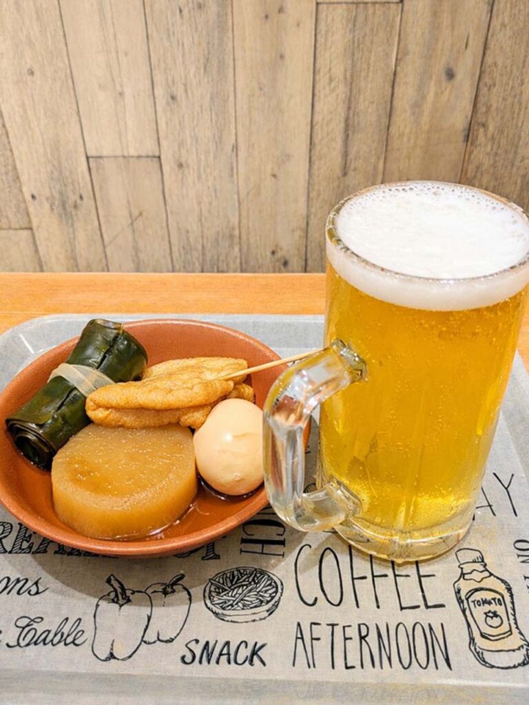 寒い冬にビールorサワーと温かいおでん4点セット。昆布と鰹だしで毎日仕込んでいます。体を温めたい方はぜひお越しください。